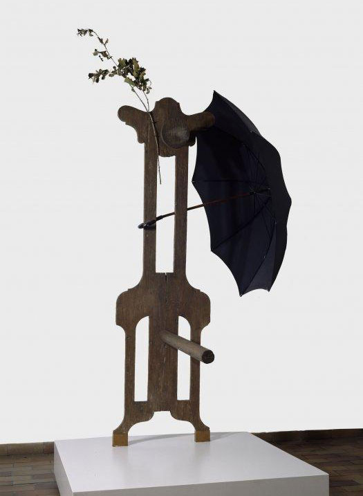 • Joan Miró: “Personaje con paraguas” (1931), reconstrucción irónica de un hombre con parte de un aparador, un paraguas, un listón y flores de papel.