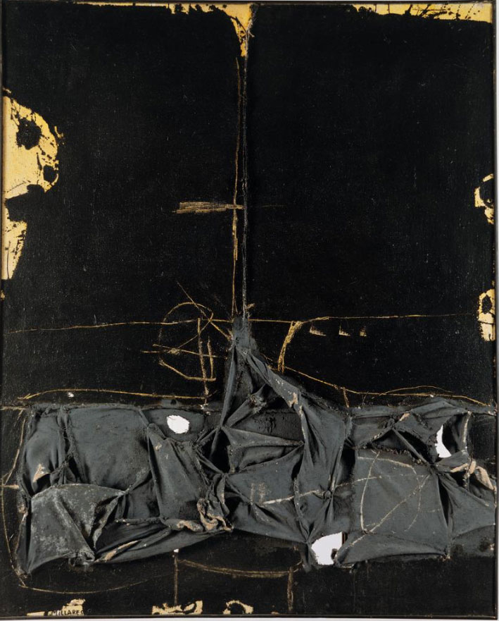 Manolo Millares (1926-1972), que se centra en el collage, empleando telas de saco recosidas, rotas o quemadas; trapos viejos; elementos de deshecho, objetos en los que el tiempo ha provocado la destrucción, dándoles un sentido expresivo-pesimista; estos objetos los colorea con blanco, negro y rojo, a modo de vendajes sangrantes (“Pintura nº 2”, h.1960)