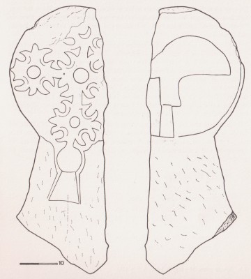 Se hacían entonces las decoraciones, que en Estella consistían en incisiones de punzón (surcos, cenefas u ondulaciones) o en relieves (rosetas , discos, letras, anagramas, etc.) hechos aparte en moldes y luego pegadas al vaso, a veces también teñidas de colores diversos.