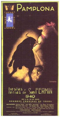 Este mismo año, 1940, realizará el cartel anunciador de las Fiestas de San Fermín, tras la selección realizada por el jurado entre 18 dibujos presentados a concurso. Dice Arriba… el 3 de marzo: “la característica del cartel premiado es conservar dentro de la más moderna técnica, el carácter inconfundible de los carteles clásicos”. Su lema fue “Brío”: dentro de un manchón negro resplandece en amarillo-oro un fulgor que sirve de fondo para contornear el escorzo de un toro zaíno que persigue a un muchacho que se desvanece, en blanco tenue, con las manchas rojas del pañuelo y la faja en la oscuridad.