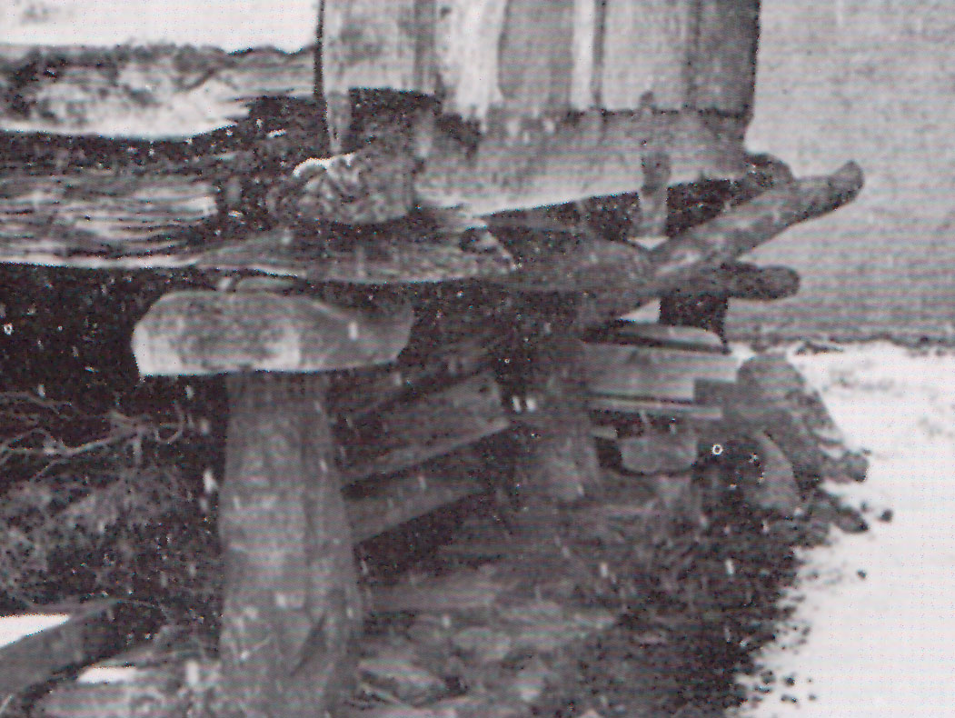 - Cierre entre los pilares de sustentación de la pared derecha en mampostería, con objeto de defender de la lluvia la parte inferior del hórreo, usada como leñera.