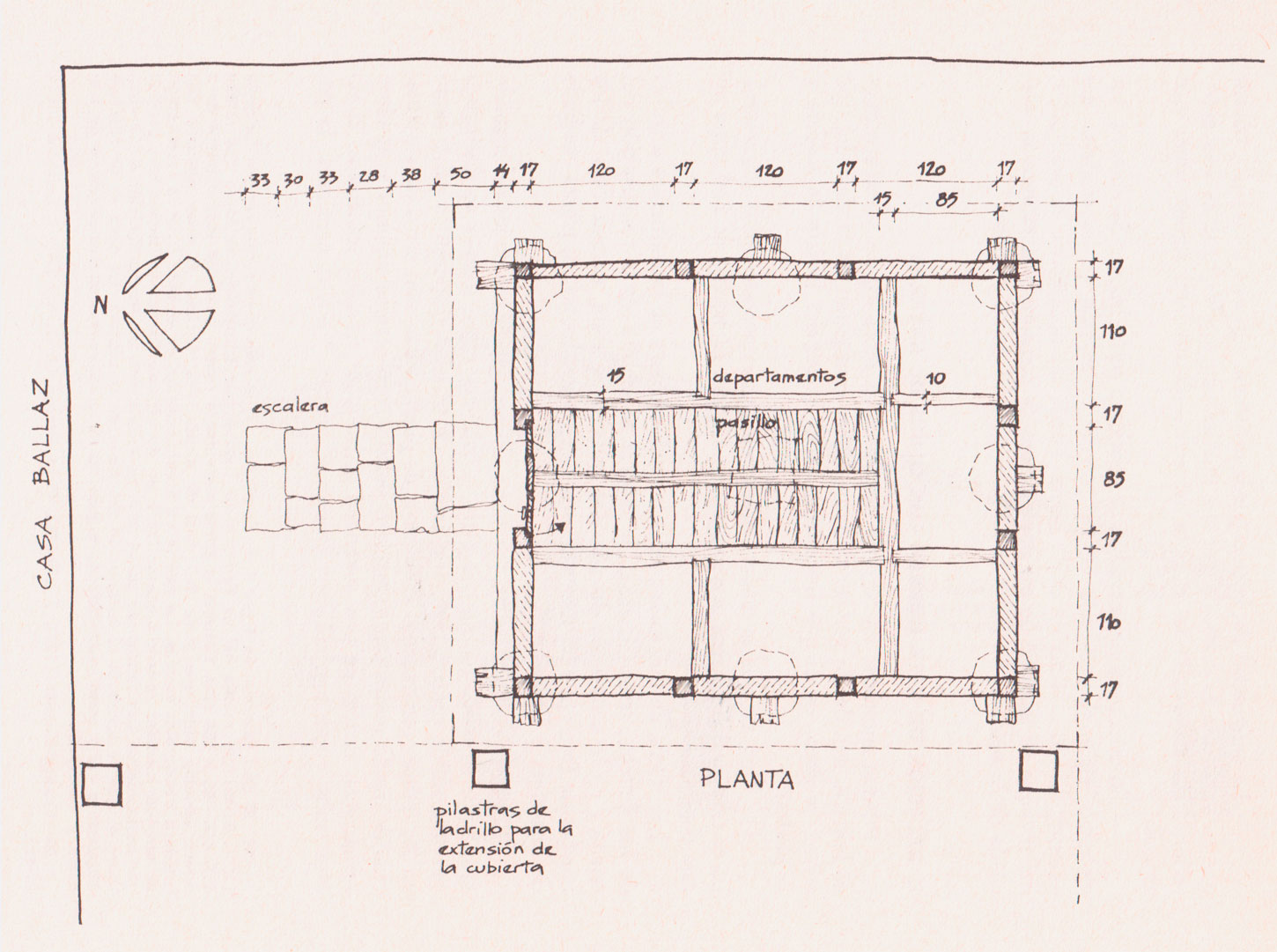 - Extensión de la cubierta, lado derecho, prolongándola hasta la calle, para su uso también como almacén de leña. Esta cubierta ha sido ya derruida, aunque no todavía las pilastras de ladrillo en las que se sustentaba, sin afectar en nada a la estructura del hórreo.