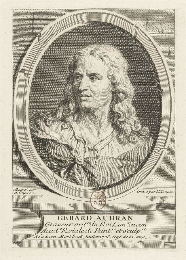 Gérard Audran nació en Lyon el 2 de agosto de 1640 y falleció en París el 26 de julio de 1703, sobreviviendo a su amigo Charles Le Brun. Duplessis [49] nos informa que pertenecía a una familia de artistas grabadores, decoradores y pintores franceses del siglo XVII que se mantendrá activa hasta principios del siglo XVIII, procedentes de Lyon. Las personalidades más célebres de la dinastía fueron el personaje que contemplamos y el decorador pintor Claude Audran III [50].