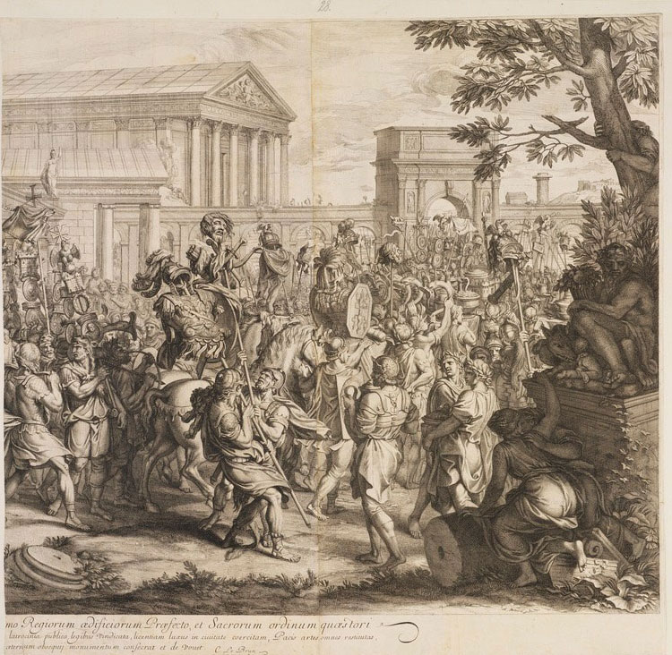 El Triunfo de Constantino en la versión grabada de G. Audran, a partir del cartón para tapiz homónimo de Charles Le Brun (Tomado de Nivelon)